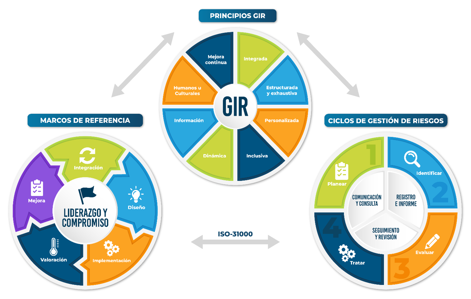 En la gestión de riesgos interactúan de manera sistemática y dinámica 3 pilares fundamentales: la cultura, la estructura organizacional y la normativa, en torno al ciclo de gestión de riesgos.