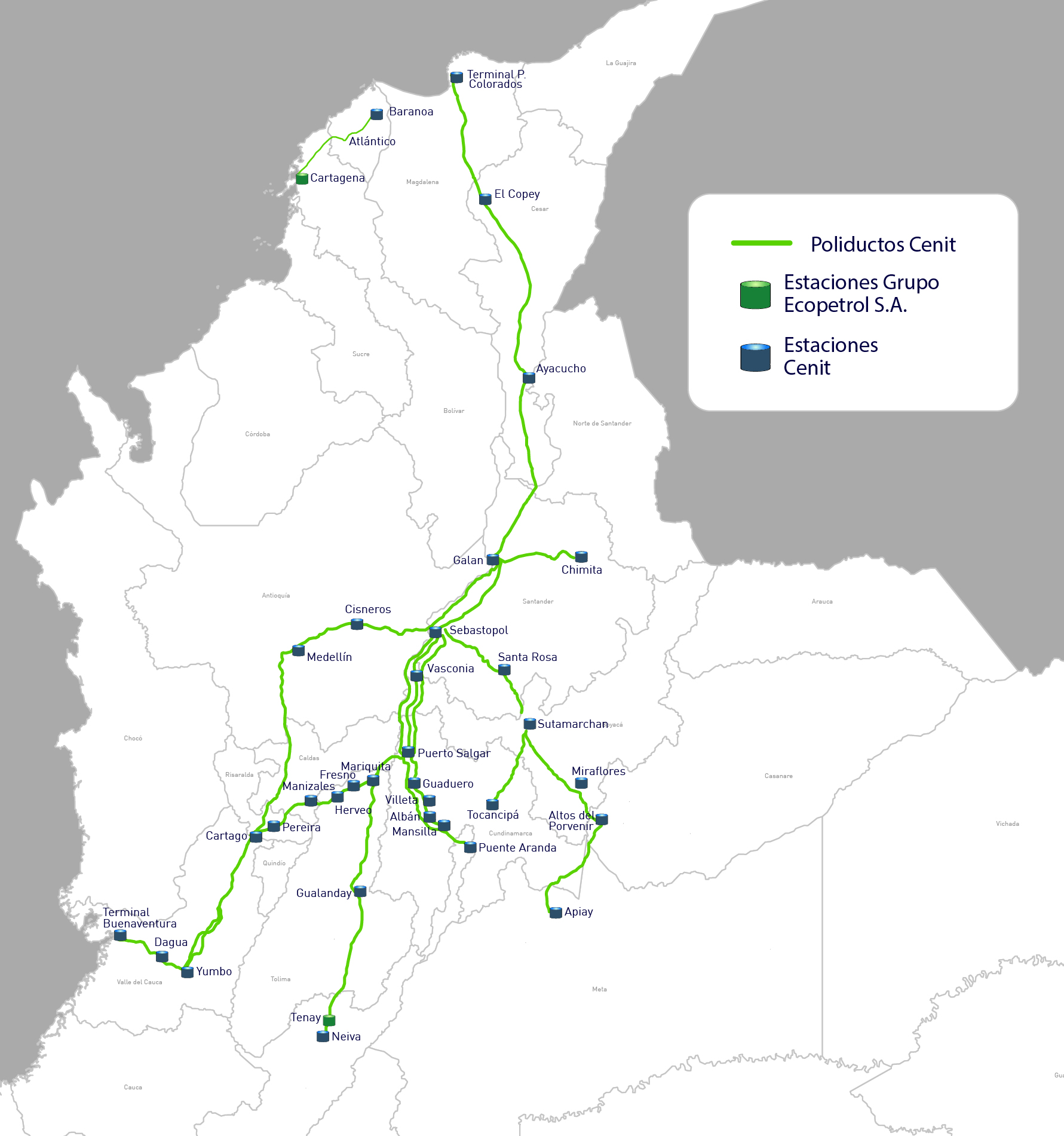 Cenit cuenta en la actualidad con una red de poliductos distribuidos por zonas en todo el territorio nacional, de esta manera garantiza el abastecimiento de productos Refinados y GLP a todos sus remitentes y consumidores en general.